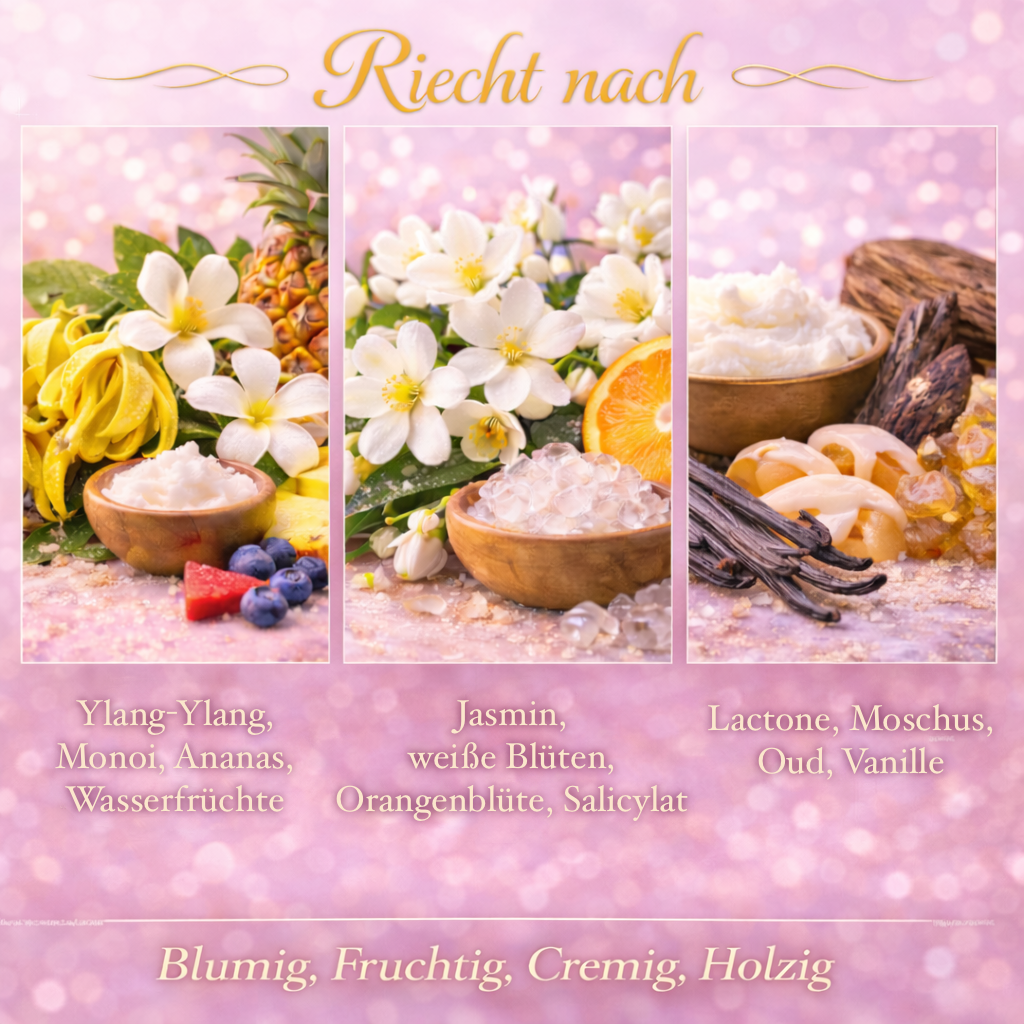 Unser Parfum May vereint fruchtige Süße, florale Eleganz und cremige Wärme zu einer leuchtenden Sommerkomposition. Die Kopfnote eröffnet mit exotischem Ylang-Ylang, tropischem Monoi, reifer Ananas und frischen Wasserfrüchten. Im Herzen blühen Jasmin, weiße Blüten und Orangenblüte auf – strahlend und feminin. Die Basis aus cremigen Lactonen, sinnlichem Moschus, feinem Oud und sanfter Vanille rundet den Duft weich und holzig ab – für ein warmes, sonniges Dufterlebnis, das dich sanft durch den Tag begleitet.